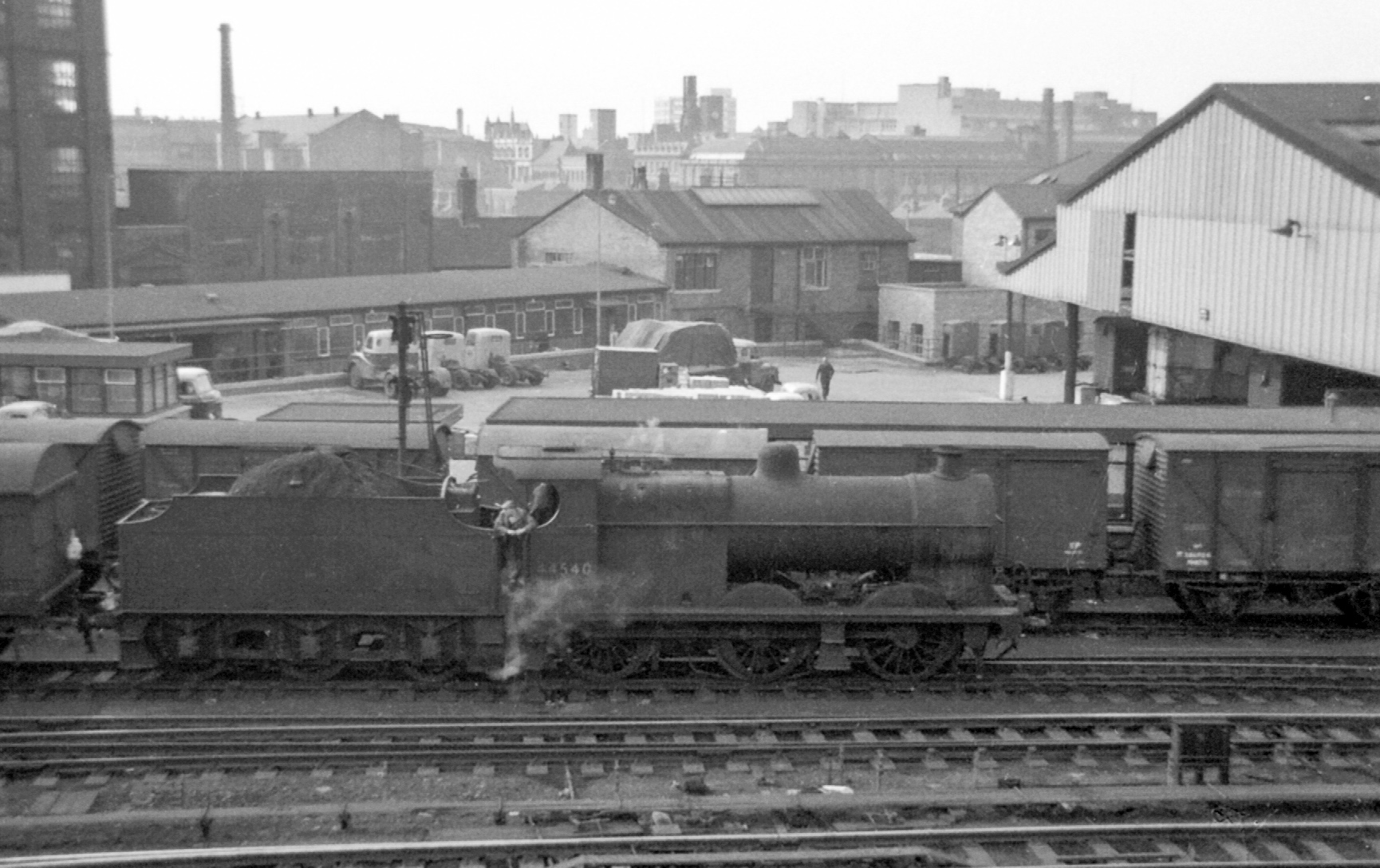 3-of-9) Ex-Midland ‘4F’ 0-6-0 no. 44540 was station pilot at Leicester Midland on 7.4.1964. Photographed from the ‘Birdcage’ (ie. Hutchinson Walk) it is just outside London Road Station shunting wagons in the parcels sidings alongside the station. This locomotive is recorded as being withdrawn the following month.