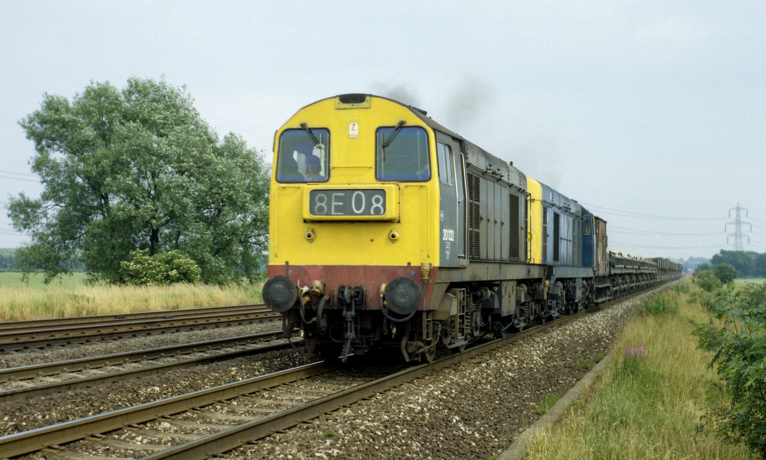 10-of-13) Cl 20 nos. 20132 & 20054 with a ballast train head north on the Midland Main Line at Allsop's Lane crossing, south of Loughborough, 9/7/75.