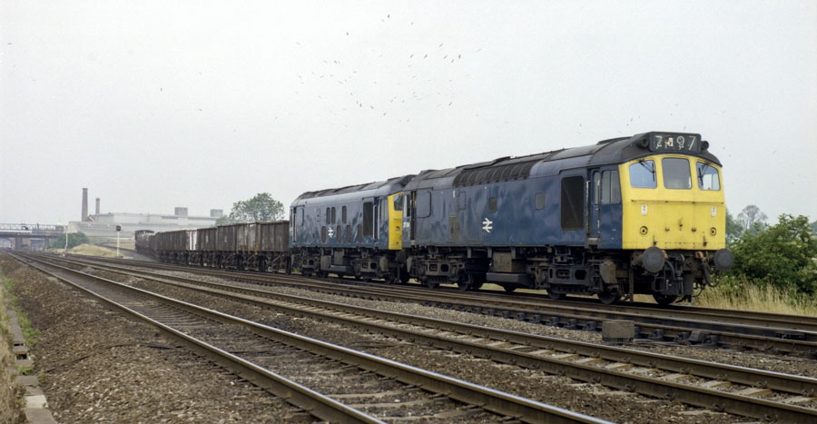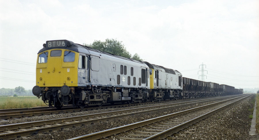 3-of-13) A pair of Class 25 locomotives, nos. 25104 & 25037, bring a train down the chord from the ex-Great Central Railway to the Midland Main Line south of Loughborough, while seagulls which scavenge from the nearby tip wheel overhead, 9/7/75.